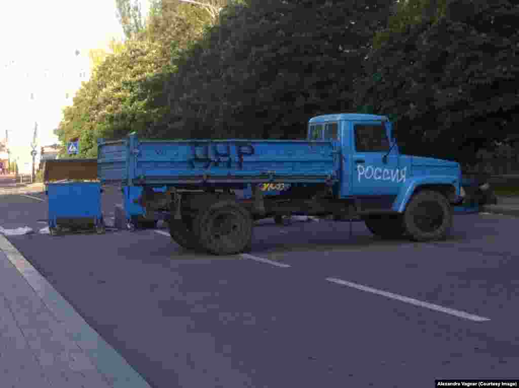 Луганск. Граффитиялъул "рагъ": Россиялъул байрахъ бахъун буго шагьаралъул централиял майданазул цоялда.