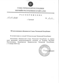 На официальном сайте главы Чеченской республики опубликовано распоряжение Рамзана Кадырова, датированное 13 января, в котором он заявляет о своей "временной нетрудоспособности" и делегирует свои полномочия председателю правительства Муслиму Хучиеву.