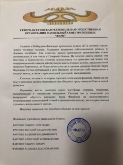 "Мы в очередной раз вынуждены обратить внимание Заура Фарниева на недопустимость пренебрежения элементарной этикой и принципами агъдау (неписанный свод этических правил – прим.ред.), на которых веками строилась жизнь нашего народа", говорится в заявлении представителей фамилии.