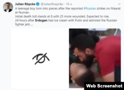 "Подростка разорвало на куски во время предполагаемых российских авиаударов по городу Маарет-эн-Нуаман. Это произошло ровно сутки после того, как Эрдоган ел мороженое с Путиным, восхищаясь российскими истребителями (…)", - отмечает немецкий журналист Джулиан Ропске.