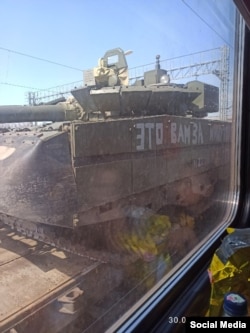 Этот же пользователь "ВКонтакте" (из хронологии снимков в его профиле следует, что он ехал из Крыма в центр России) выложил фотографию еще одного танка Т-80, но уже в более современной модификации "БВМ". Геотег в публикации указывает на то, что фотография была сделана на станции Кутейниково в Ростовской области. На борту танка написано "Это вам за ми…" – часть букв разобрать невозможно. Судя по всему, машина уже побывала в боях – однако по снимку сложно с определенностью сказать, в каком направлении следует состав.